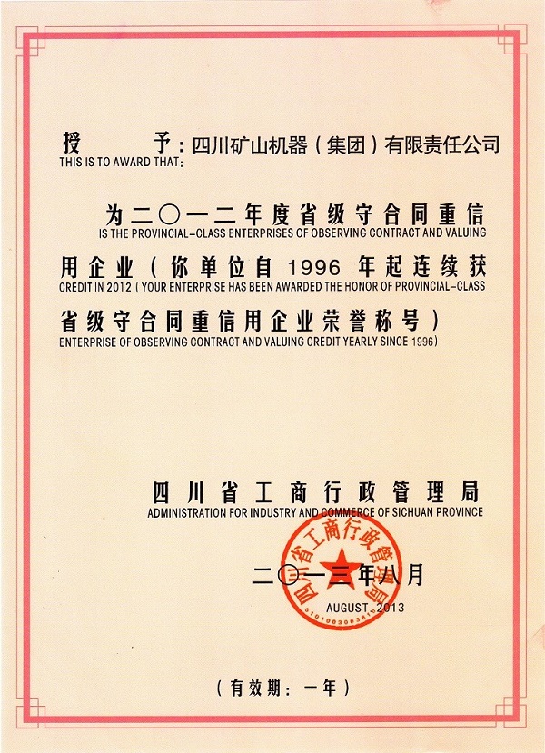 川礦集團(tuán)公司日前,從省工商局獲悉,四川礦山機(jī)器(集團(tuán))有限責(zé)任公司喜獲“省級(jí)守合同重信用企業(yè)”稱(chēng)號(hào)(公司自1996年起連續(xù)獲省級(jí)守合同重信用企業(yè)榮譽(yù)稱(chēng)號(hào)),并頒發(fā)了榮譽(yù)證書(shū)。