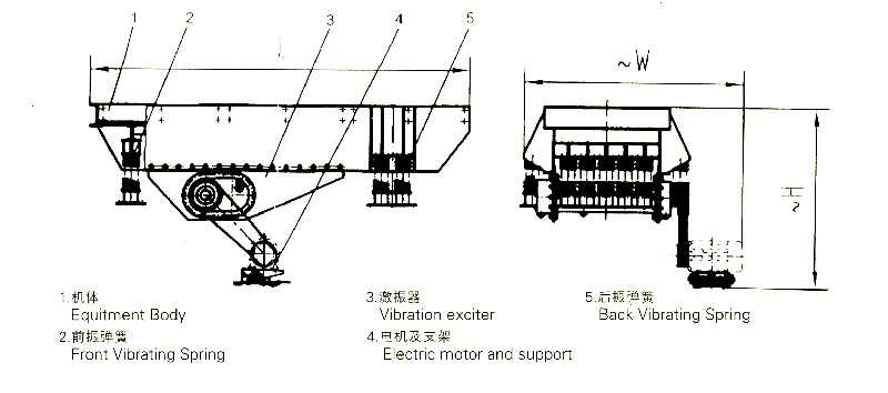 振動(dòng)給料機(jī)是由給料槽體、激振器、彈簧支座、傳動(dòng)裝置等組成。槽體振動(dòng)給料的振動(dòng)源是激振器,激振器是由兩根偏心軸(主、被動(dòng))和齒輪副組成,由電動(dòng)機(jī)通過(guò)三角帶驅(qū)動(dòng)主動(dòng)軸,再由主動(dòng)軸上齒輪嚙合被動(dòng)軸轉(zhuǎn)動(dòng),主、被動(dòng)軸同時(shí)反向旋轉(zhuǎn),使槽體振動(dòng),使物料連續(xù)不斷流動(dòng),達(dá)到輸送物料的目的。